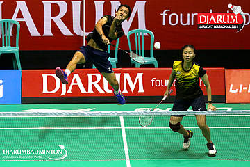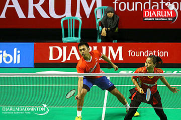 Tedi Supriadi/Dian Fitriani (Berkat Abadi, Banjar+Pertamina Fastron, Jakut) mengembalikan shuttlecock