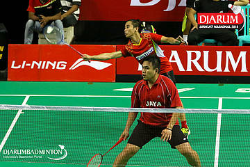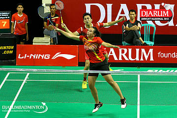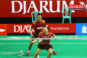 Rizko Asuro/Keshya Nurvita Hanadia (Pertamina Fastron, Jakut+Berkat Abadi, Banjar) menyambut serangan