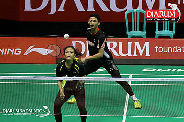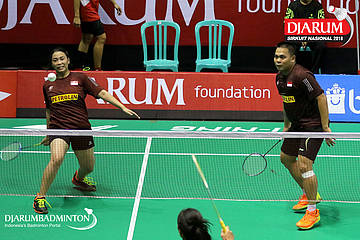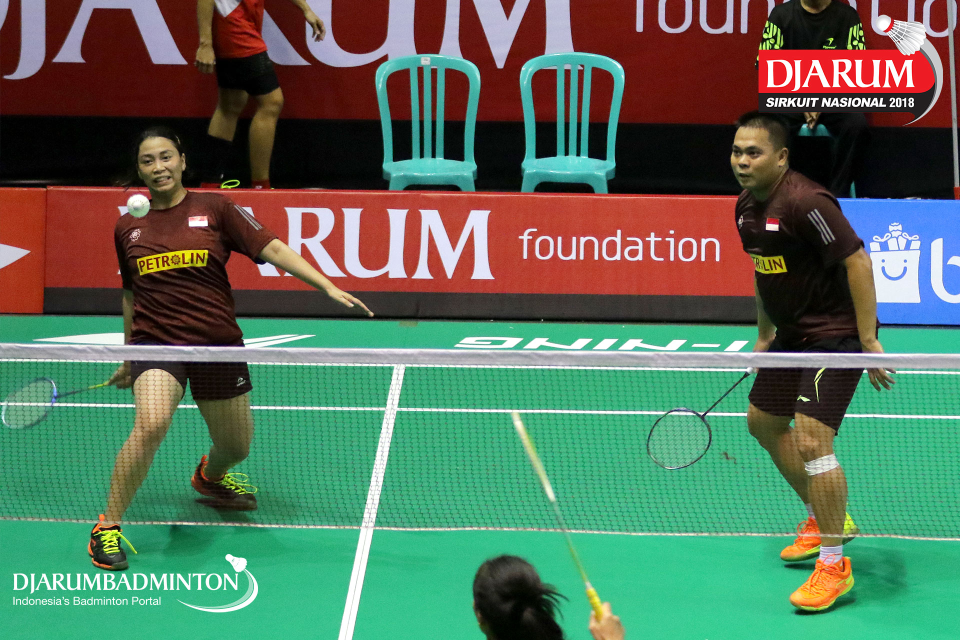 Abdul Kadir Zailani/Linda Mutiara Pertiwi (Mutiara Cardinal, Bandung+PB.SENDAWAR BADMINTON CLUB) mengembalikan shuttlecock