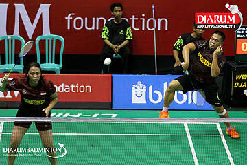 Markis Kido/Pia Zebadiahbernadet (Jaya Raya Jakarta, Jakpus) berusaha mengembalikan serangan