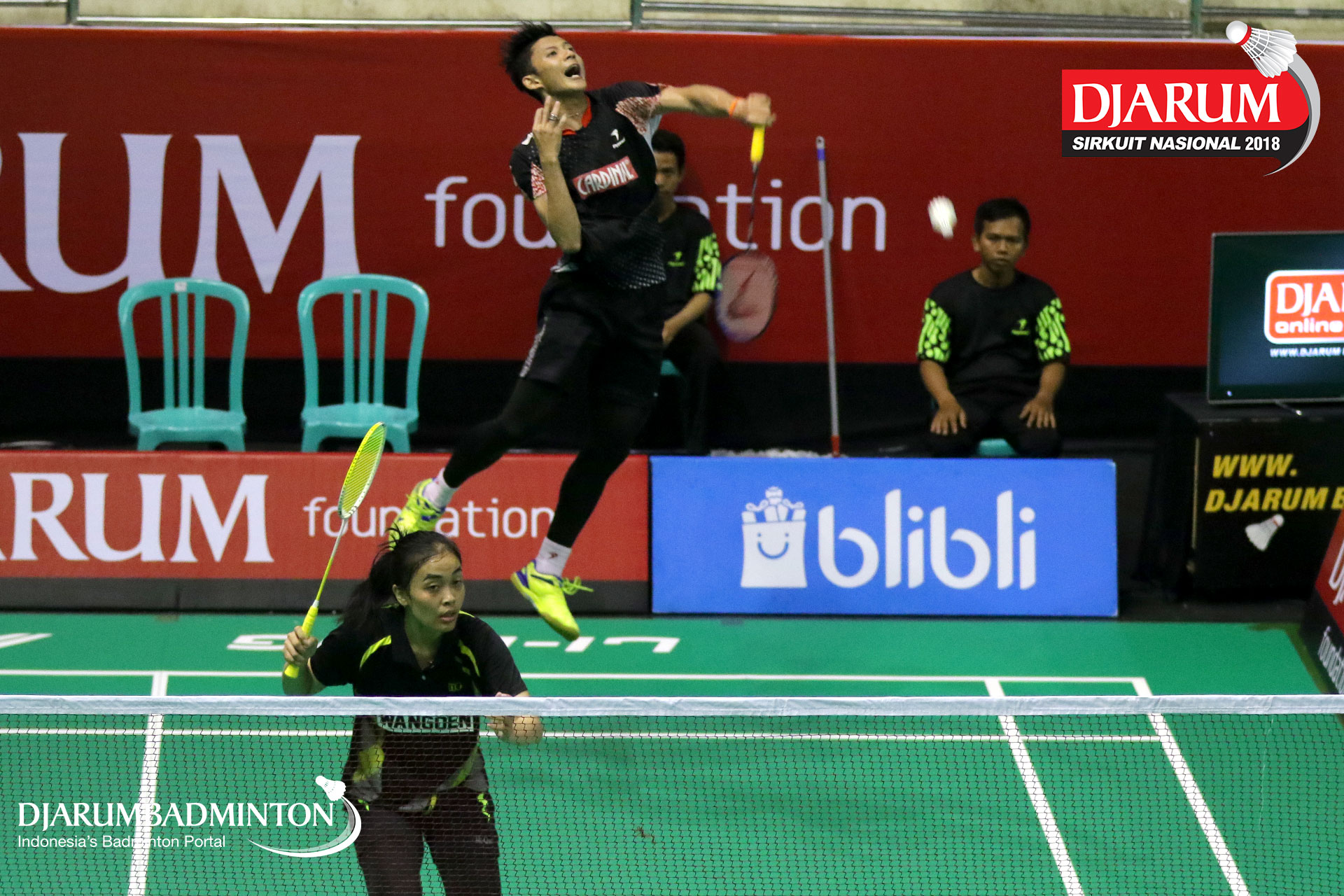 Abdul Kadir Zailani/Linda Mutiara Pertiwi (Mutiara Cardinal, Bandung+PB.SENDAWAR BADMINTON CLUB) melepaskan smash
