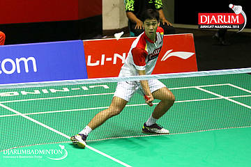 Muhammad Aldo Apriyandi (PB Djarum, Kudus) berusaha mengembalikan serangan