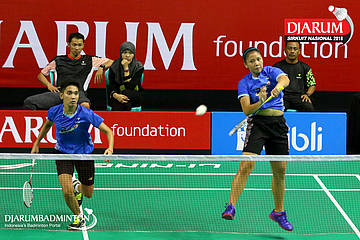 Nugroho Andi Saputro/Tiara Rosalia Nuraidah (Halim, Jakut+Mutiara Cardinal, Bandung) melepaskan serangan