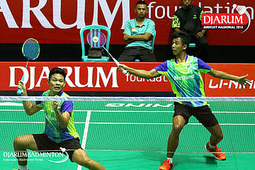 Alfa Rizki Fadlika/Andre Timotius Tololiu (Jaya Raya Jakarta, Jakpus) menyambut shuttlecock