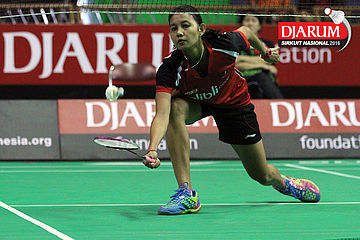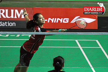 Devi Yunita (Djarum Kudus) mengembalikan shuttlecock