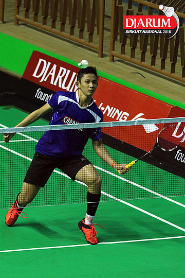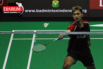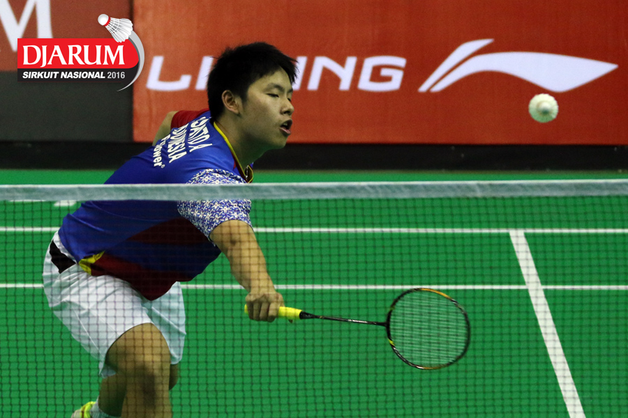 Andrew Susanto (Sarwendah) mengembalikan shuttlecock