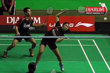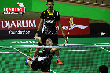 M. Taufiqul/Vanadia Pranasa (Djarum Kudus) mengembalikan shuttlecock