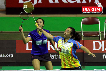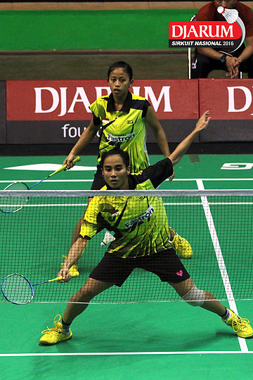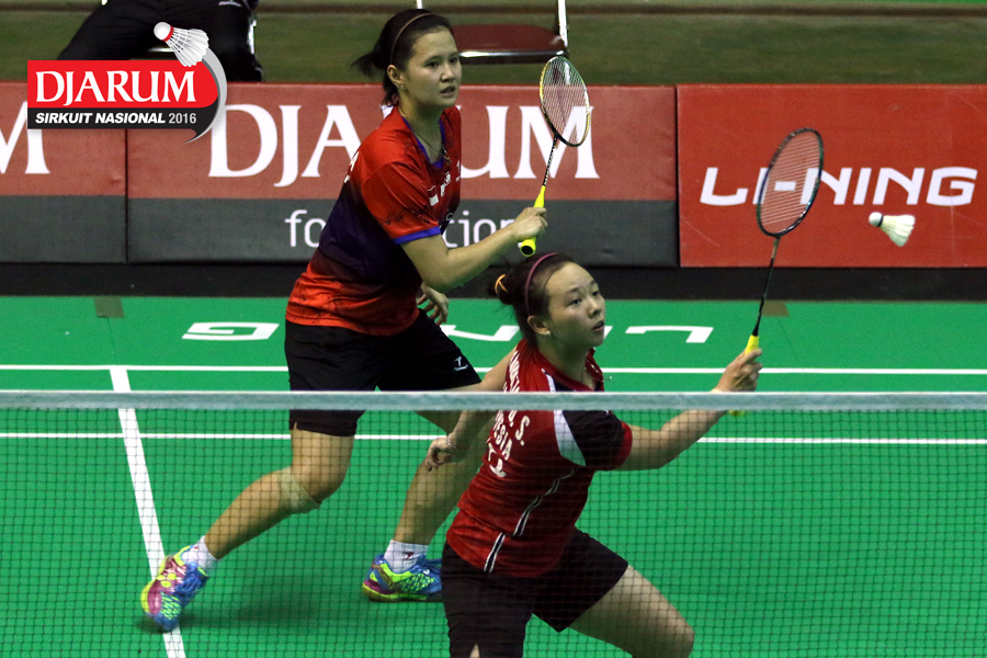Gebby Ristiyani/Weni Anggraeni (Mutiara Cardinal/Jaya Raya) mengembalikan shuttecock