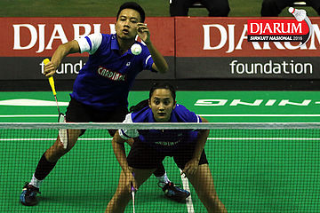 Tedi SUpriadi/Ririn Amelia (Djarum Kudus) bersiap menyambar pengembalian