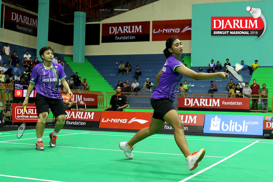 Apriani Rahayu/Jauza Fadhila S (Jaya Raya Jakarta) mengembalikan serangan lawan