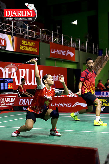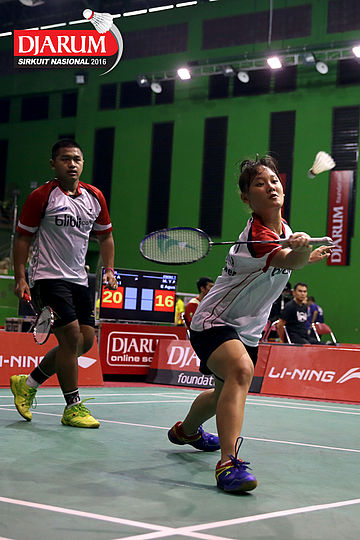 Aditya Muchlis/Annisa Mubarokah (FIFA Badminton) Mengembalikan Shuttlecock.