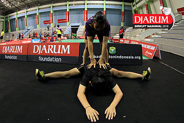 Ni Made Pranita dan Made Deya Surya saat melakukan stretching.