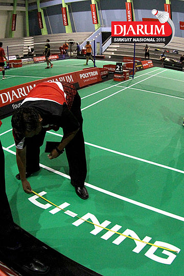 Salah satu referee memeriksa perlengkapan lapangan pertandingan.