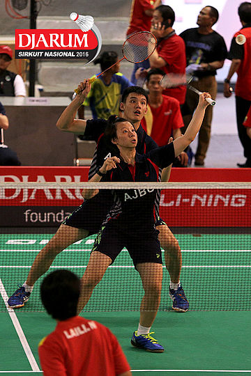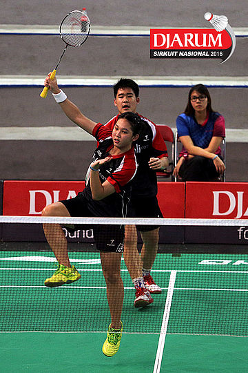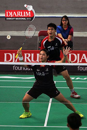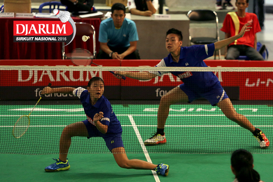 Michael Henry/Ribka Sugiarto (Djarum Kudus) bersiap menyambar pengembalian