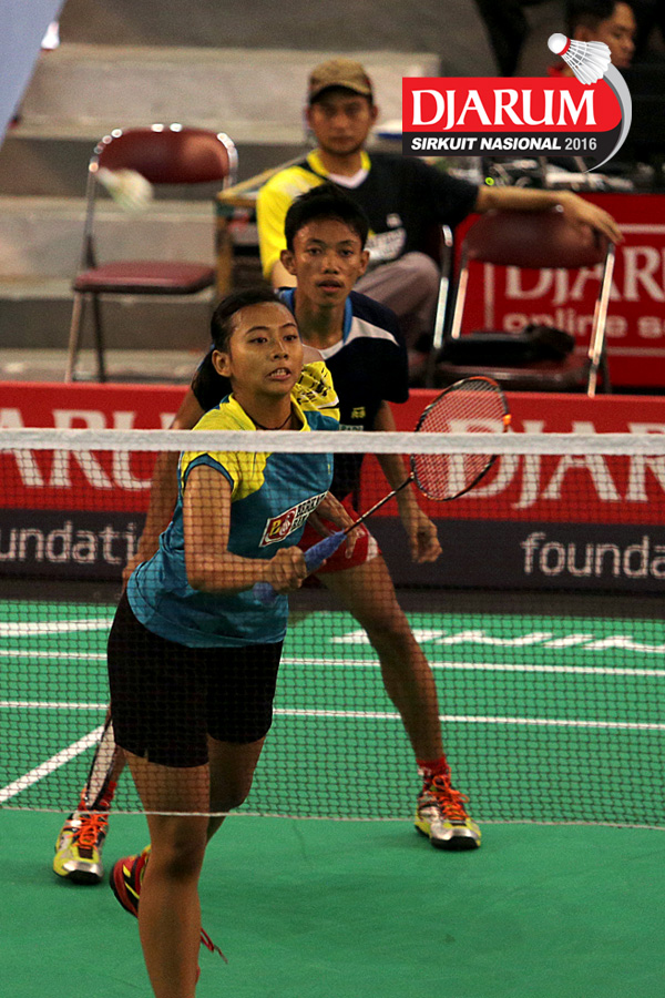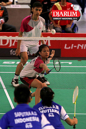 Angga Dian/Elvira Arumningtyas (Mutiara Cardinal) mengembalikan shuttlecock