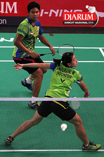 Irfan Fadhillah/Weni Anggraeni (Jaya Raya) melepaskan backhand
