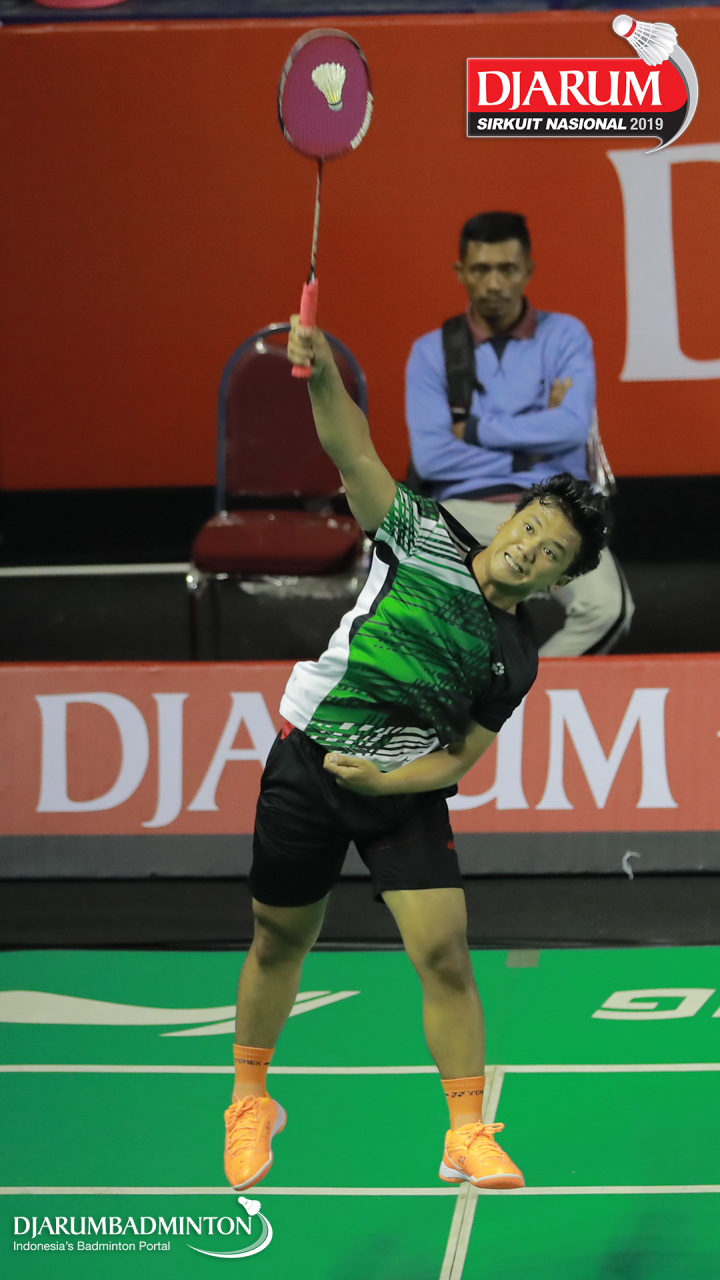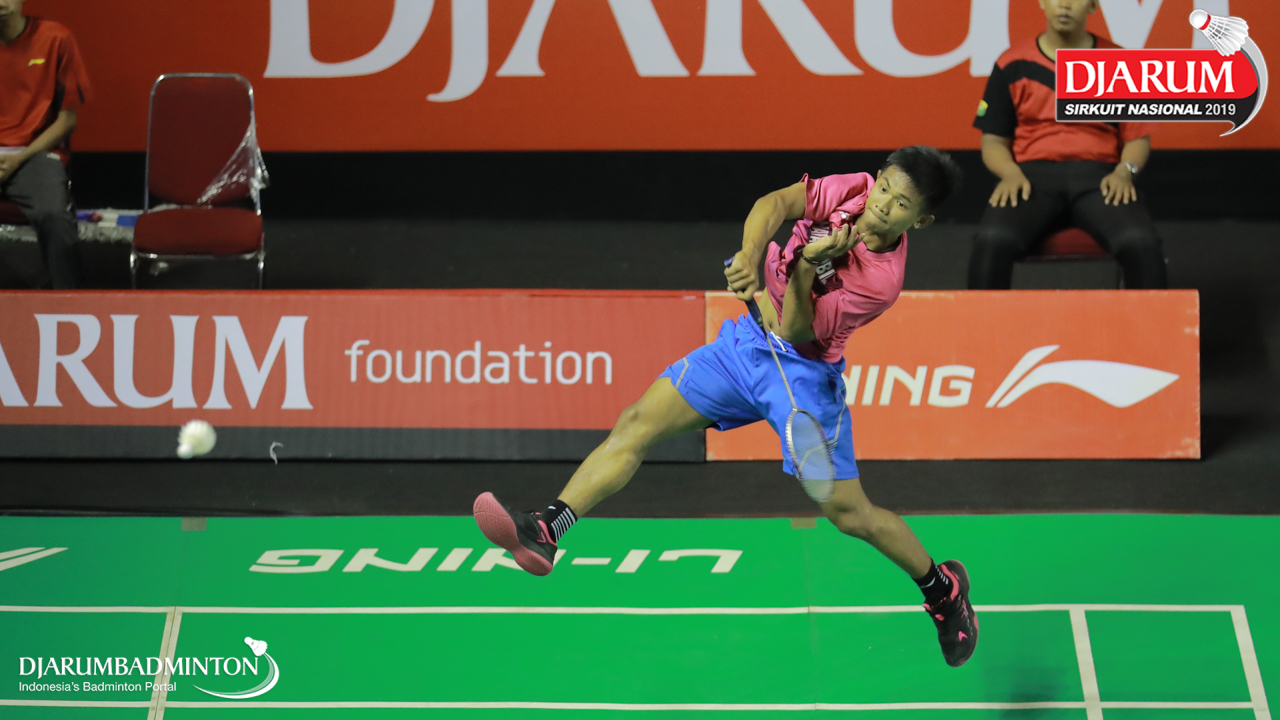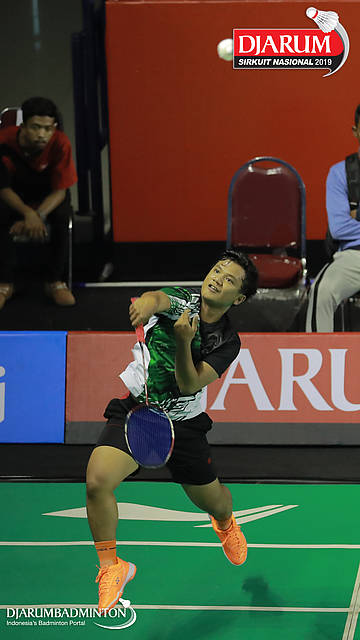 Dwiki Arsyi Syahnanda (Sentra, Banjarmasin) bersiap menyambut shuttlecock