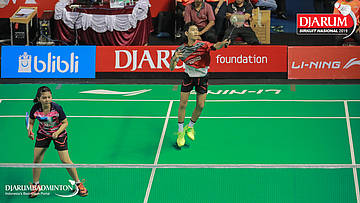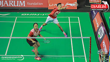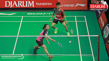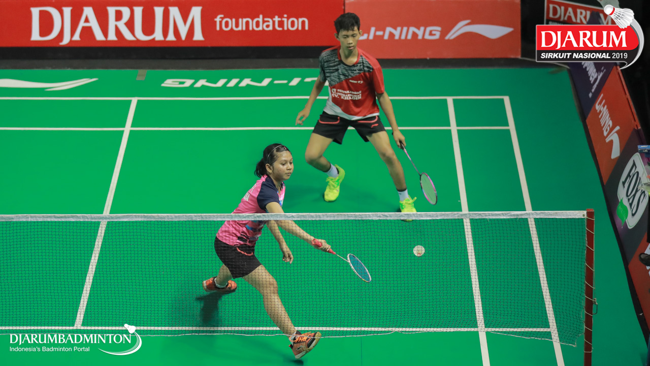Muhammad Rendy+Adisti Rahayu (Jaya Perkasa, Barito) bersiap menyambut shuttlecock