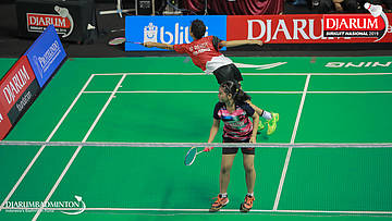 Dhefa Assya Fikri+Amira Fitria Liza (Pusat Pelatihan Olahraga Pelajar) menyambar shuttlecock