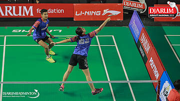 Rafi Indrajati+Karen Kusnadi (Tangkas, Jaksel) bersiap menyambut shuttlecock
