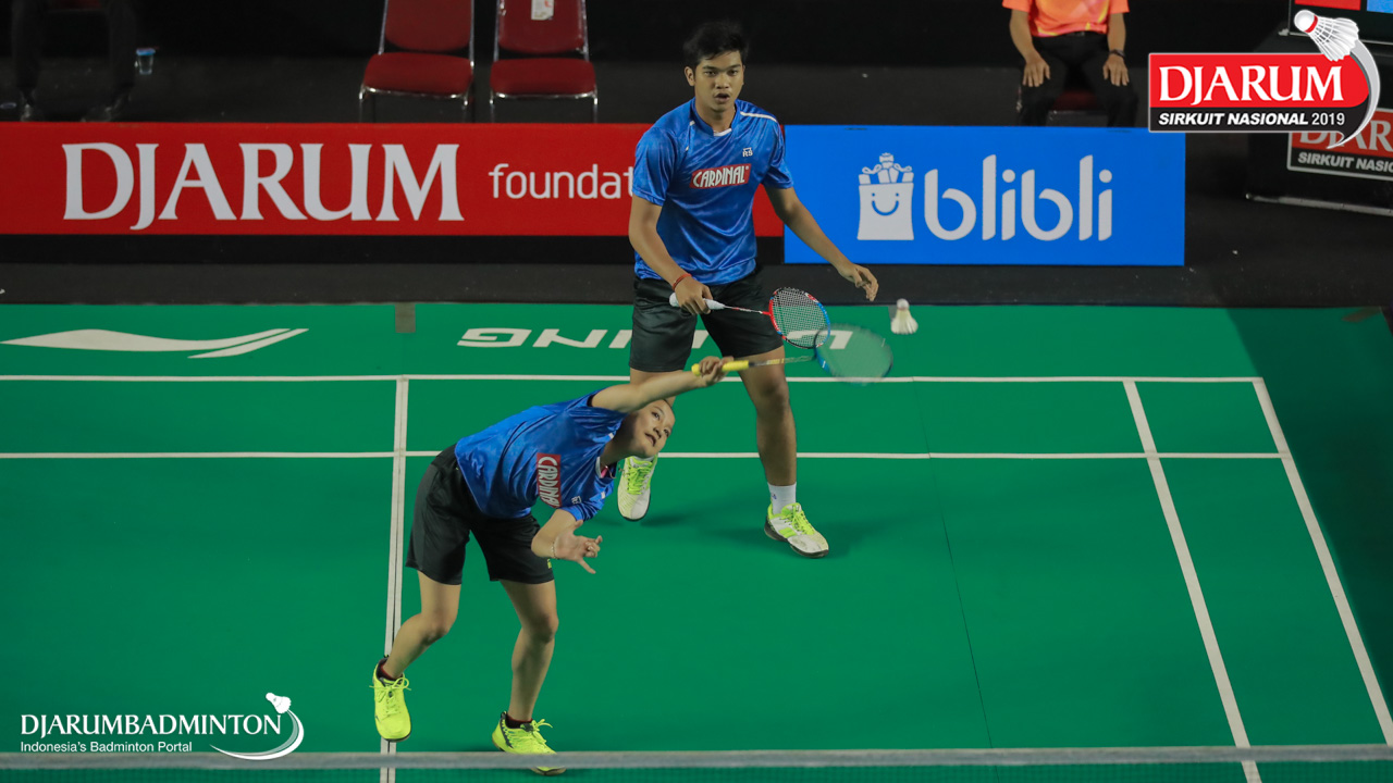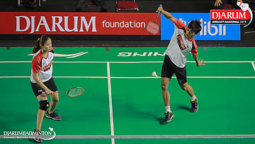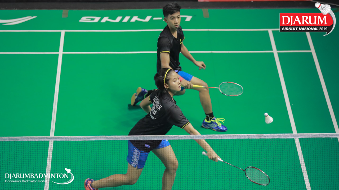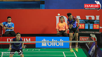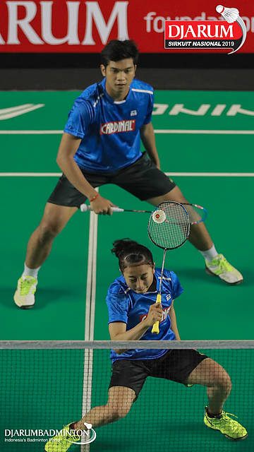 Ari Kusuma+Salsabila Dewanti (Mutiara Cardinal, Bandung) menyambut shuttlecock