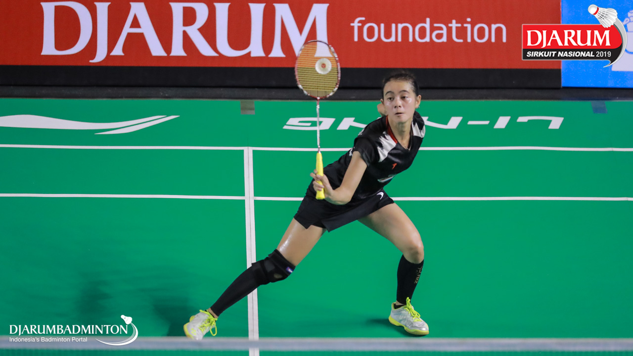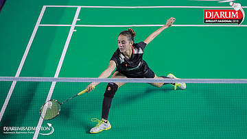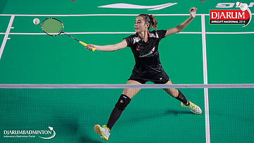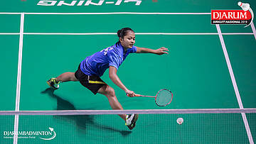Dinar Dyah Ayustine (Pertamina Fastron, Jakut) bersiap menyambut shuttlecock