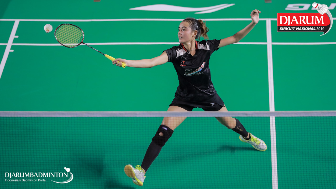 Silvi Wulandari (Berkat Abadi, Banjar) berusaha menggapai shuttlecock