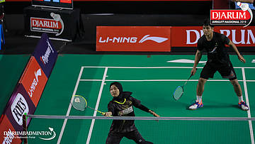Muhammad Andhika+Novara Mega Vriana (Berkat Abadi, Banjar) bersiap menyambut shuttlecock