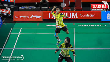 Ramsha Ariadita+Windi Siti Mulyani (PB Victory Bogor, Jaktim) bersiap melepaskan serangan