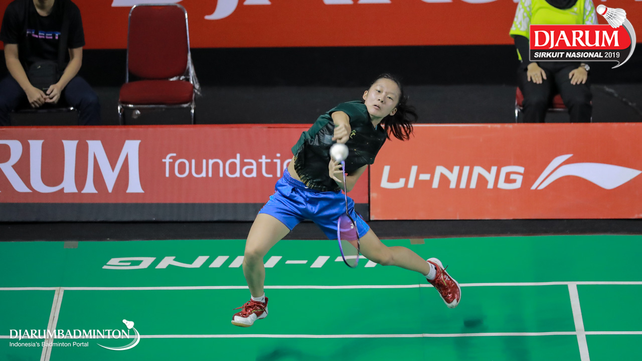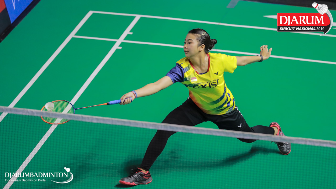 Tiara Ayuni Wulandari (Exist Badminton Club) bersiap menyambar pengembalian