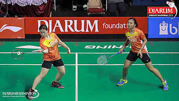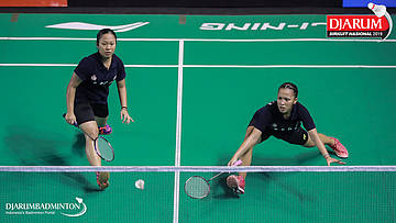 Mutiara Lailatul Nur+Stefanny Purnama Wijaya (Exist Badminton Club) bersiap menyambut shuttlecock