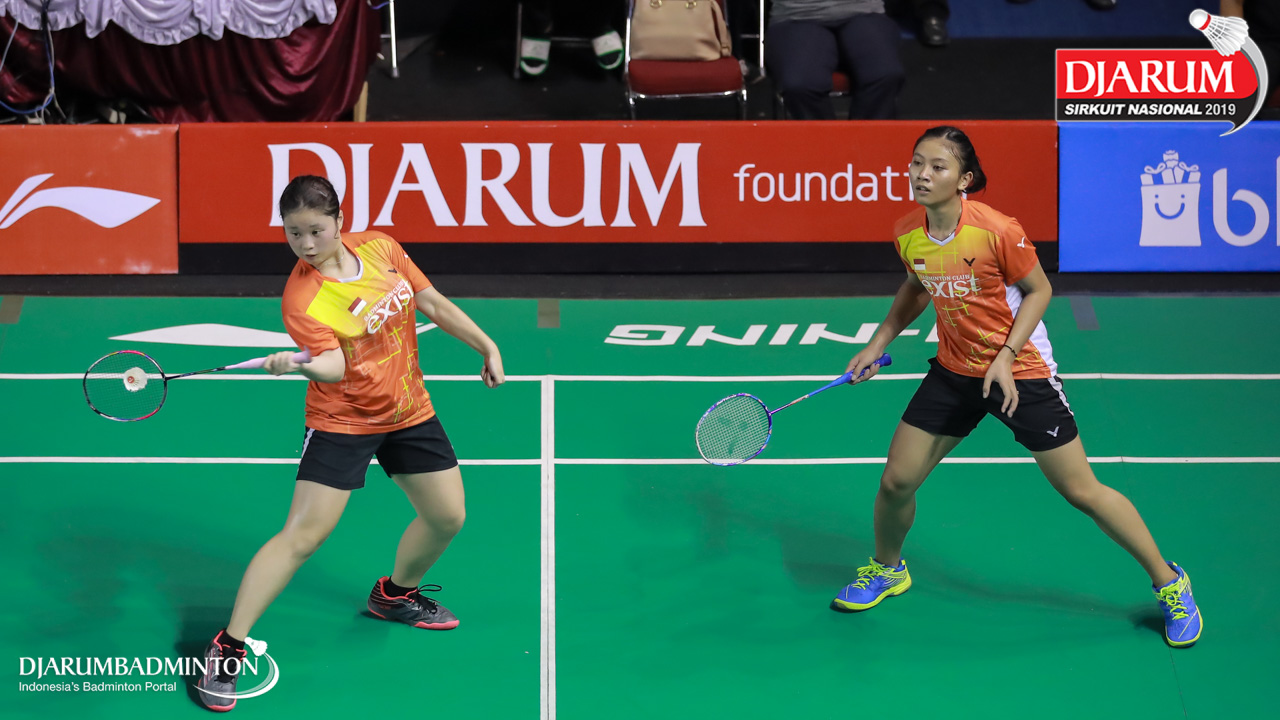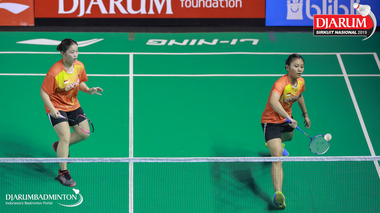 Mutiara Lailatul Nur+Stefanny Purnama Wijaya (Exist Badminton Club) bersiap melepaskan serangan