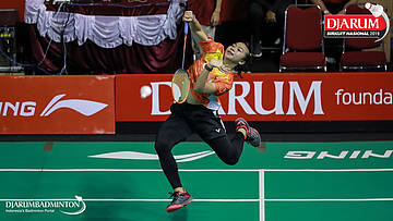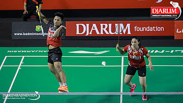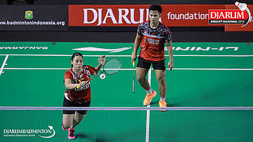 Dejan Ferdinansyah+Serena Kani (PB Djarum, Kudus) berusaha menggapai shuttlecock