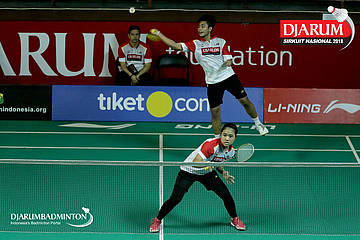 I Putu Pande Sheva Brahmantya Putra/Aldira Rizki Putri (PB Djarum, Kudus) bersiap mengembalikan shuttlecock