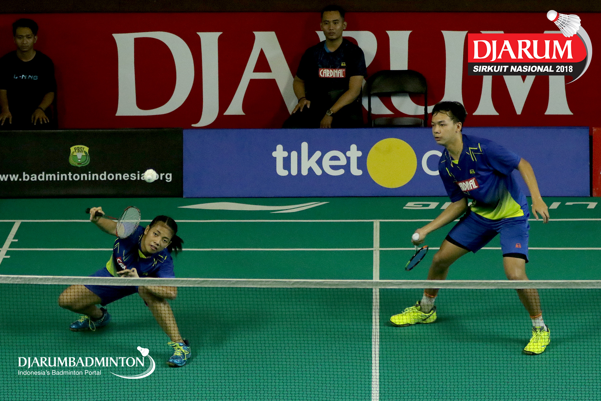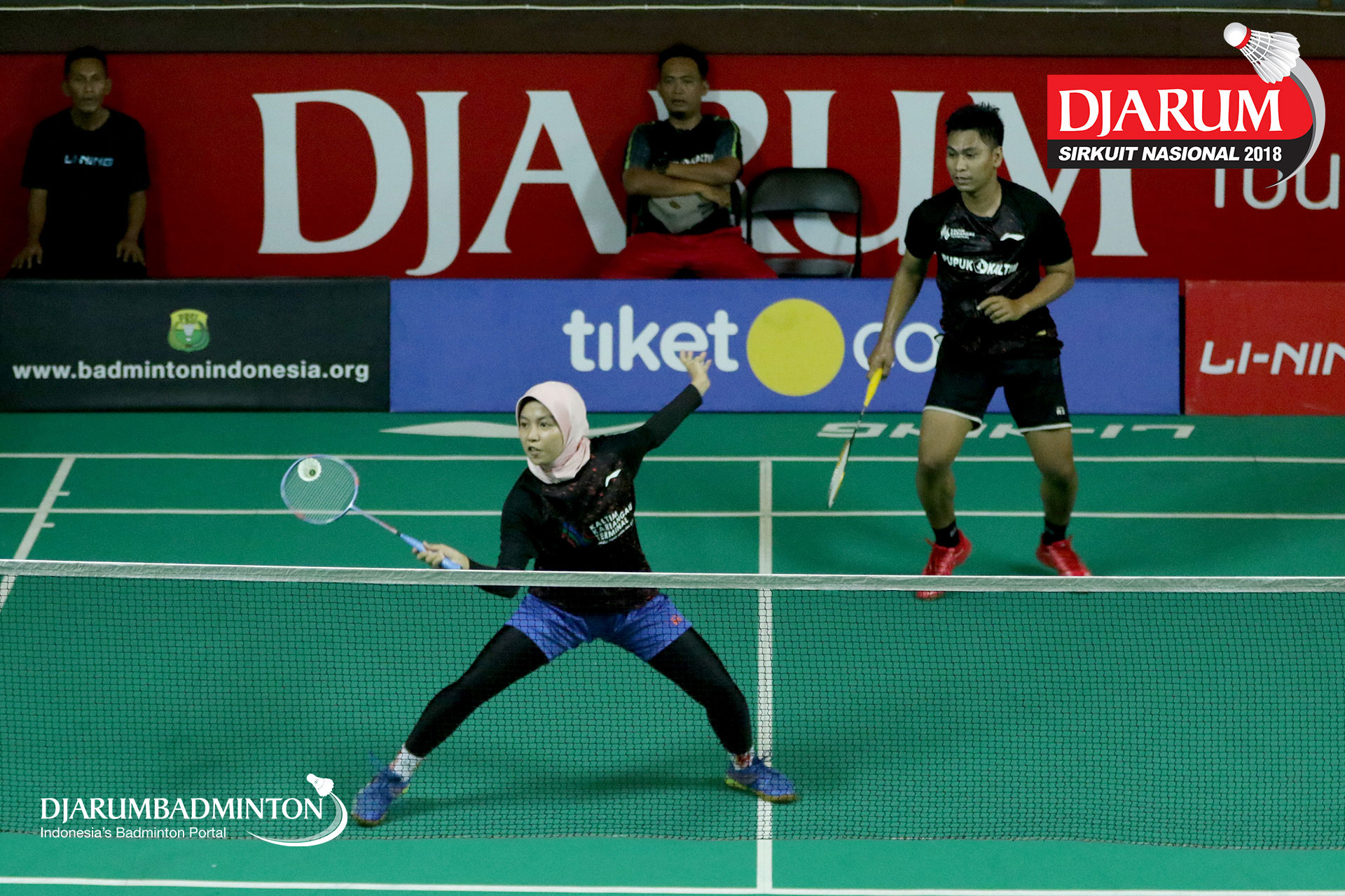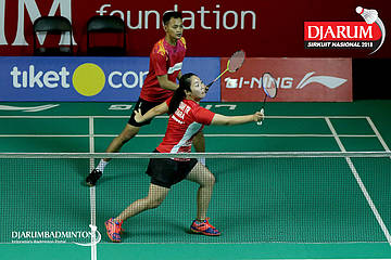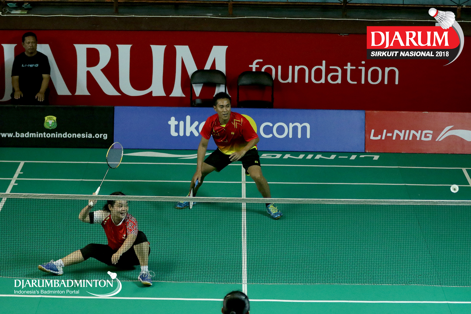 Arya Julius Fernanda/Putri Andini Wahyuningrum (Mutiara Cardinal, Bandung) berusaha membbalikan shuttlecock