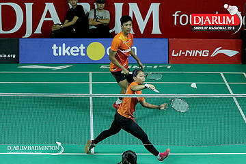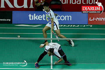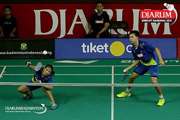 Nugroho Andi Saputro/Tiara Rosalia Nuraidah (Halim, Jakut/Mutiara Cardinal, Bandung) mengembalikan serangan