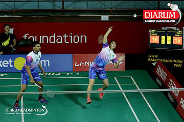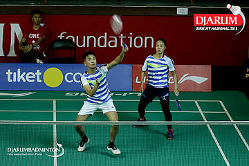 Imam Nur/Sumarni (Pupuk Kaltim Bontang/Terpadu Balikpapan) bersiap mengembalikna shuttlecock