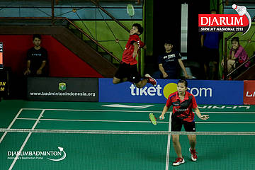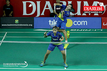 Arya Julius Fernanda/Putri Andini Wahyuningrum (Mutiara Cardinal, Bandung) melakukan smash