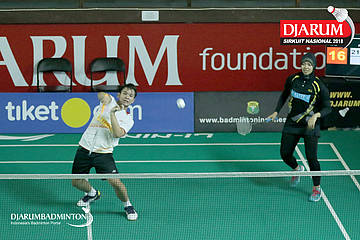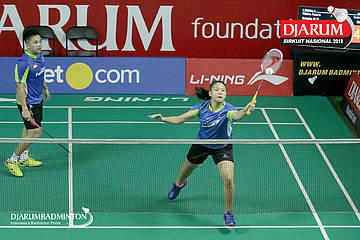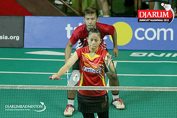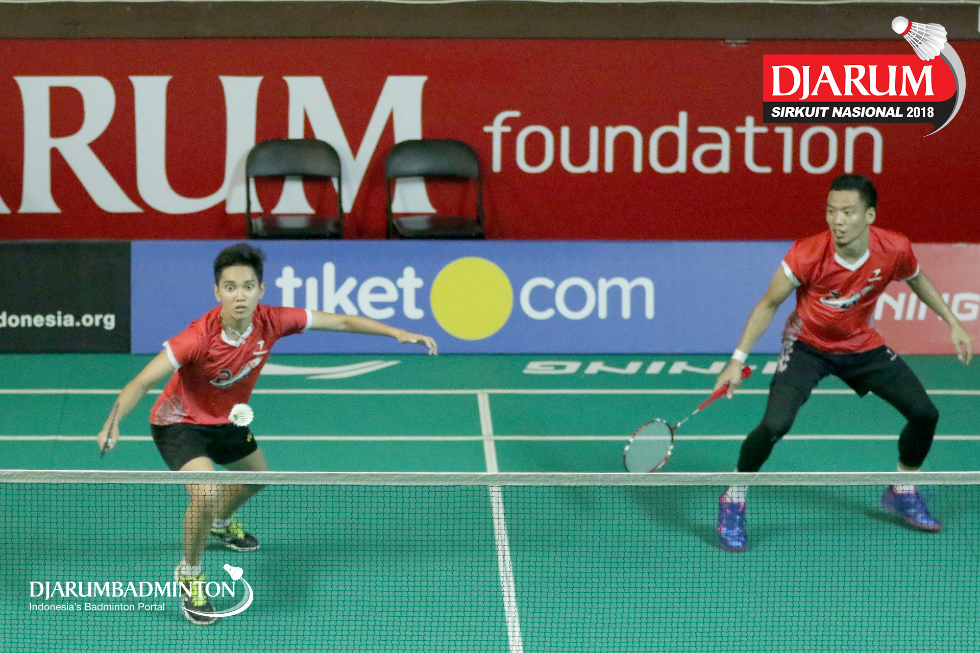 Rizko Asuro/Brigita Marcelia Rumambi (Pertamina Fastron, Jakut/Berkat Abadi, Banjar) bersiap menyambar pengembalian