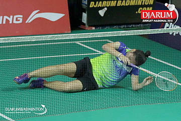 Made Deya Surya Saraswati (Exist, Jakarta) terjatuh saat mengembalikan serangan