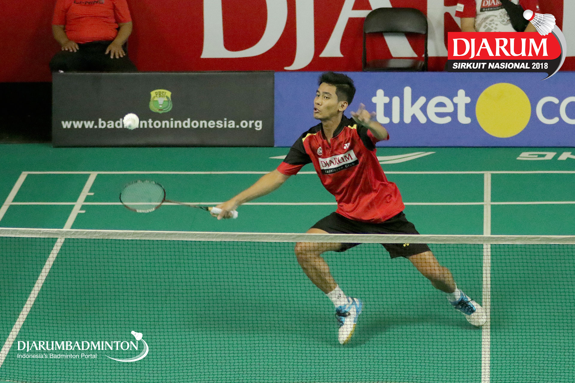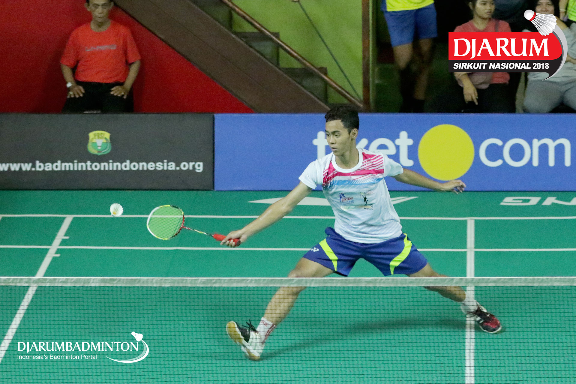 Rezha Akbar Raja Husain Ym (PB Djarum, Kudus) melepaskan smash