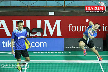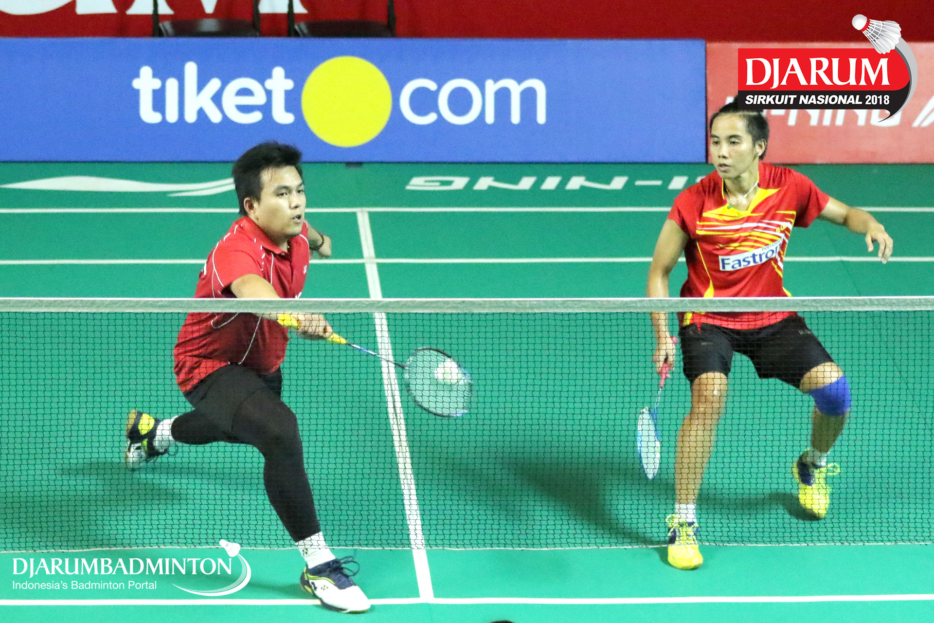 Putra Eka Rhoma/Nadiya Melati (Jaya Raya Jakarta, Jakpus/Pertamina Fastron, Jakut) menyambut shuttlecock