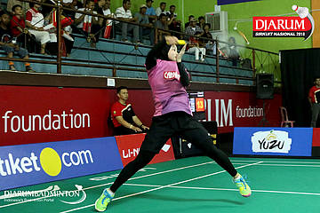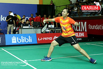 Hanna Ramadini (Mutiara Cardinal, Bandung) berusaha menyambut shuttlecock
