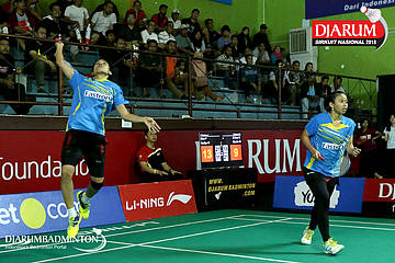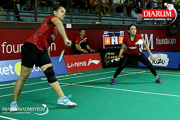 Dian Fitriani/Nadiya Melati (Pertamina Fastron, Jakut) bersiap menyambut serangan