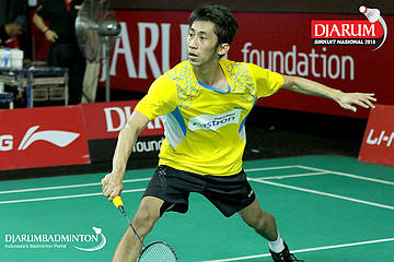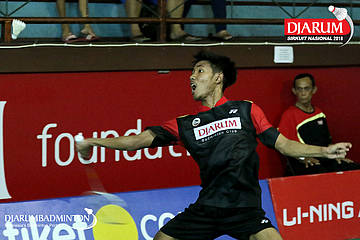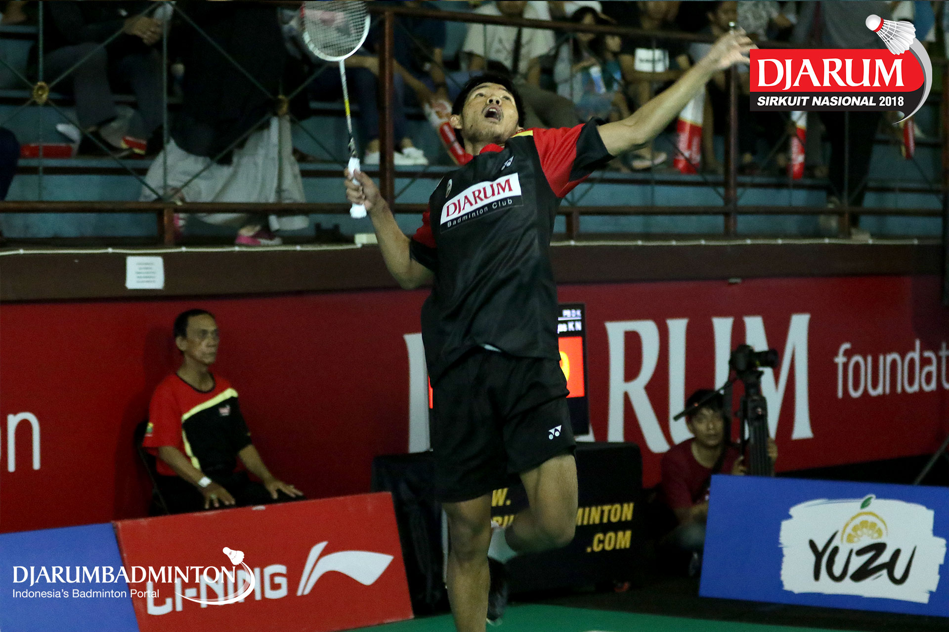 Bagas Kristianto Nugroho (PB Djarum, Kudus) berusaha mengembalikan serangan