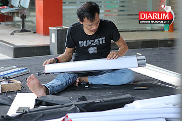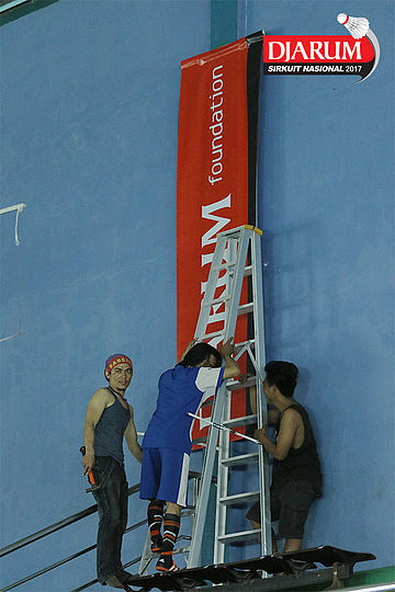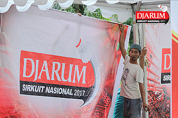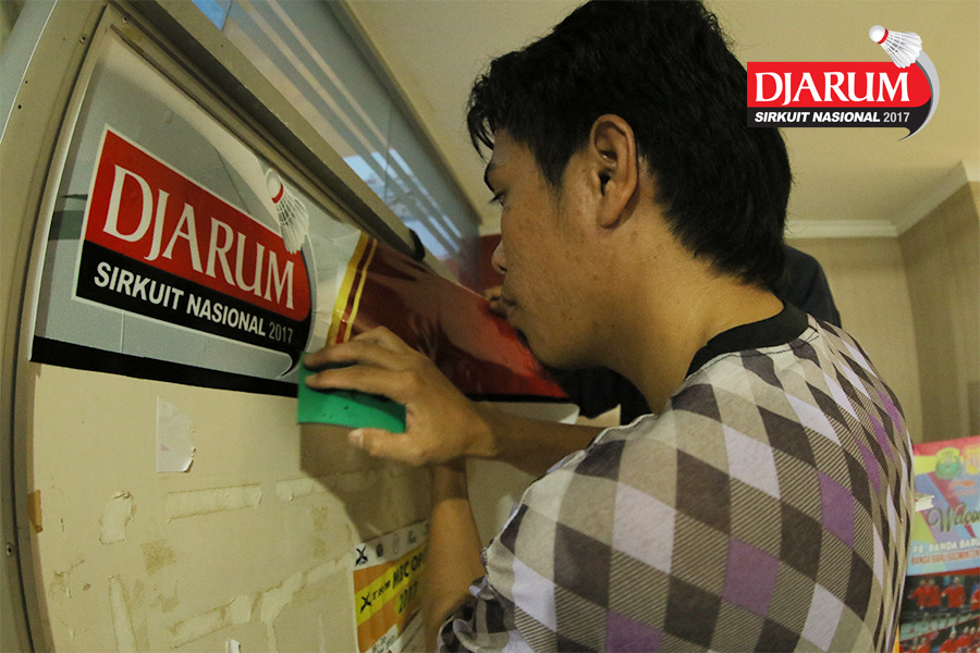 Seorang Petugas Memasang Atribut Djarum Sirkuit Nasional Li-Ning Kep. Riau Open 2017