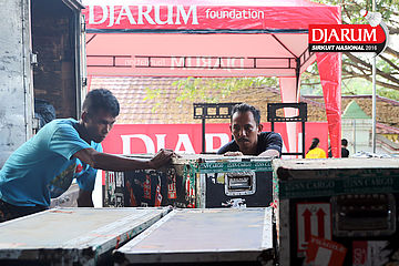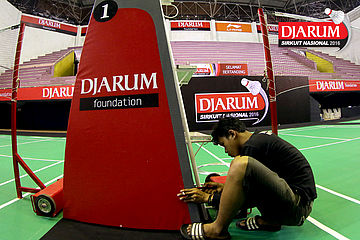 Dua pekerja mempersiapkan Dua pekerja sedang mempersiapkan perangkat Djarum Sirkuit Nasional Li-ning Lampung Open 2016