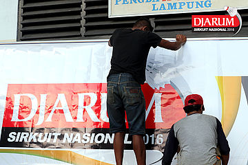 Dua orang pekerja memasang persiapan Djarum Sirkuit Nasional Li-ning Lampung Open 2016 di GOR Saburai