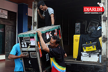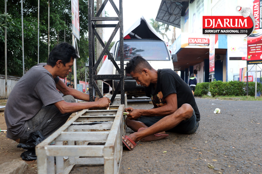 Dua pekerja sedang mempersiapkan perangkat Djarum Sirkuit Nasional Li-ning Lampung Open 2016