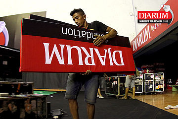 Salah satu pekerja membawa papan iklan Djarum Foundation